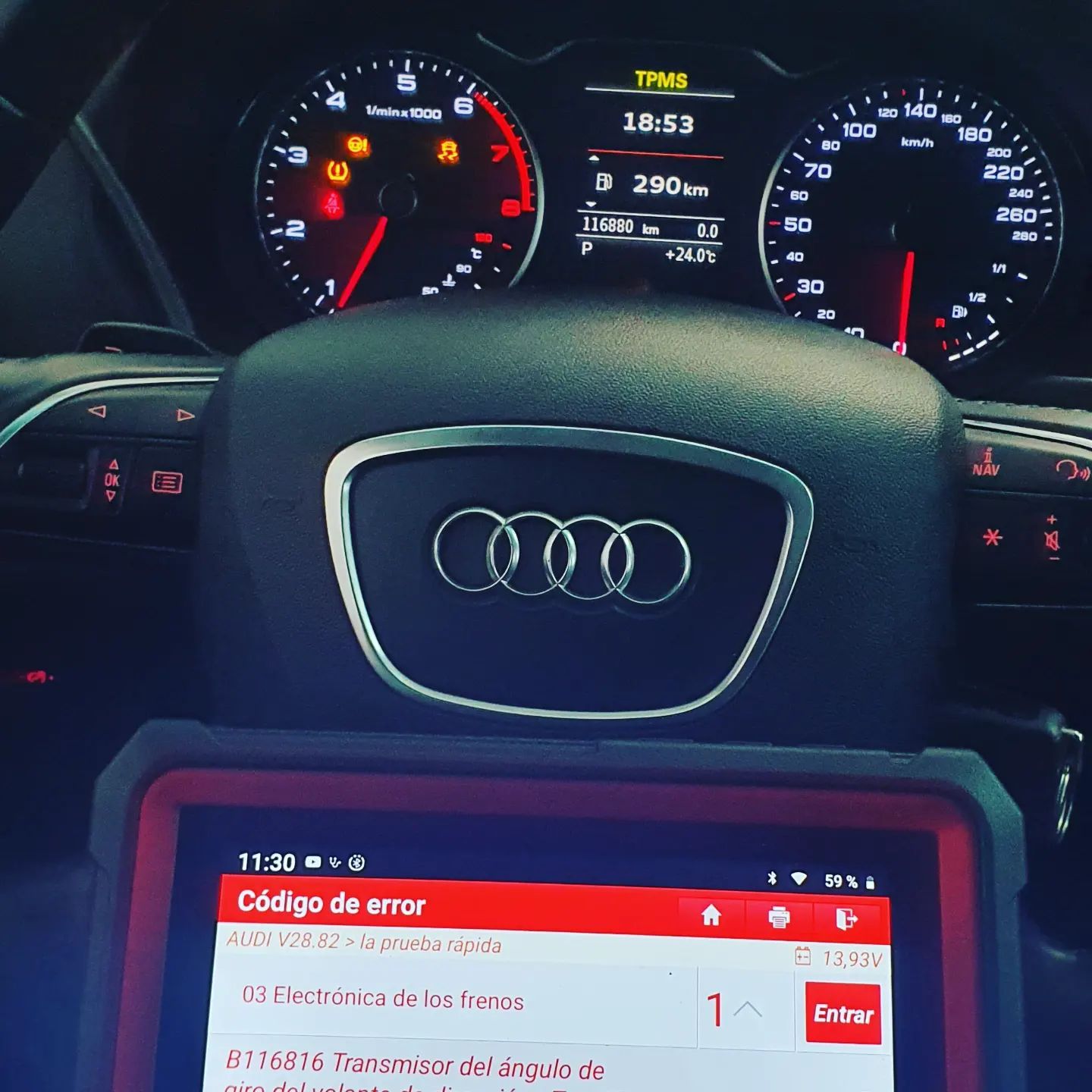 Revisión de módulos del vehículos detectando sus fallos, sistema eléctrico, estado de salud de batería, estado de carga del alternador y funcionamiento del motor de arranque, estado de disco de frenos y de las cubiertas, sensores TPMS (si el auto esta equipado con ese sistema).